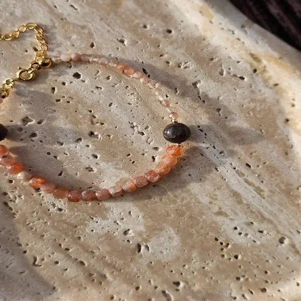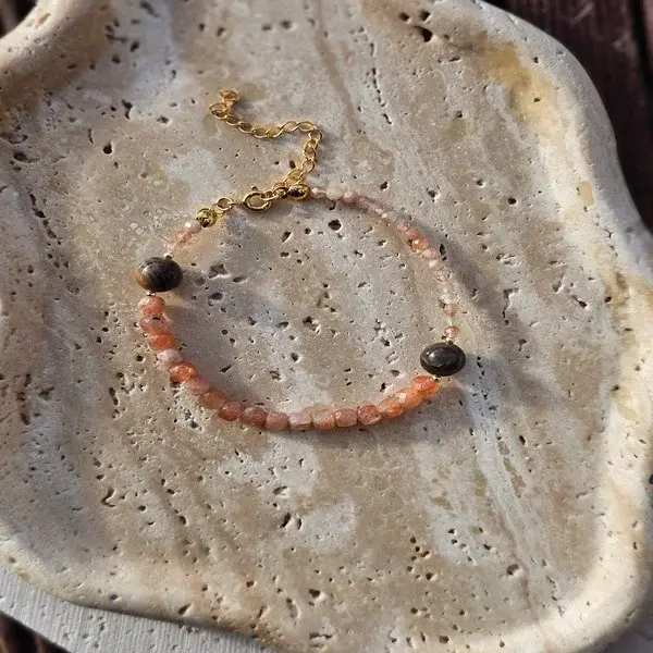 (Czas wysyłki: 5 dni)Bransoletka wykonana z kamienia słonecznego w kolorze brazowo-czarnym z dodatkiem pozłacanych kuleczek. Na nici jedwabnej. Dodatki srebro pozłacane. Całkowita długość bransoletki 16 cm + 5 cm przedłużenia.
