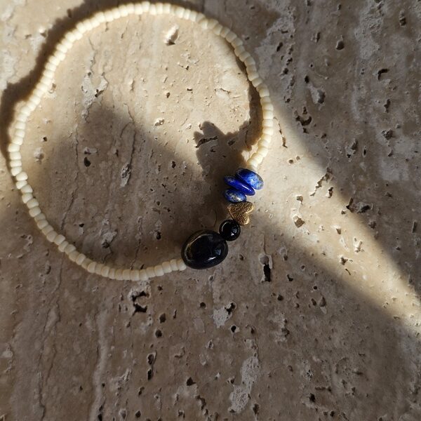 (Czas wysyłki: 5 dni)Bransoletka wykonana z koralików toho z dodatkiem kamienia lapis lazuli, kamienia turmalin z dodatkiem srebrnego serduszka w kolorze złotym. Bransoletka wykonana na gumce elastycznej idealnie nada się na co dzień – wygodna, lekka i doskonale dopasowuje się do nadgarstka, łatwo się ją zakłada i zdejmuje, nie ma zapięć. Całkowita długość bransoletki ok 17 cm.
