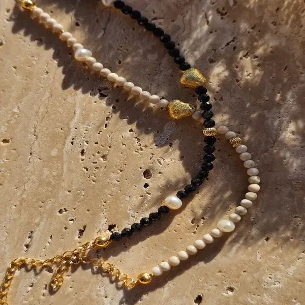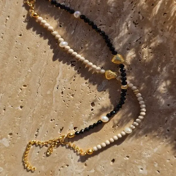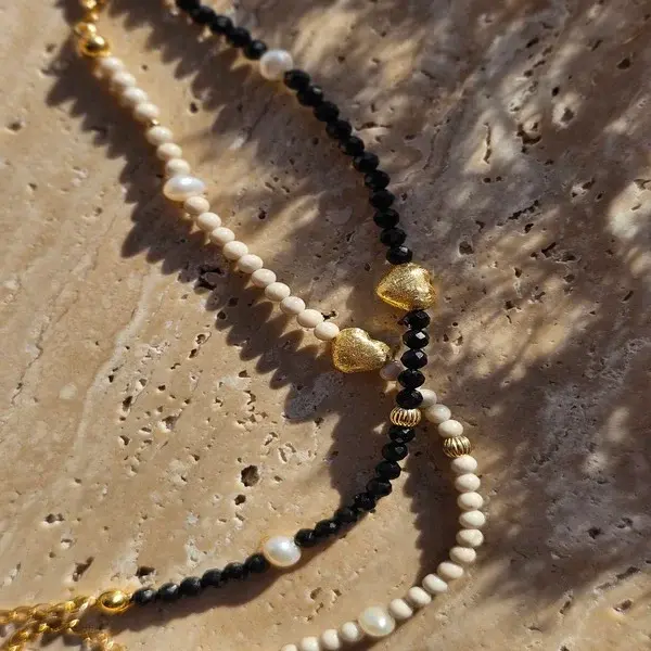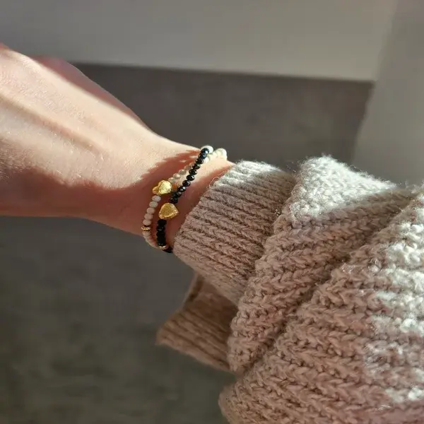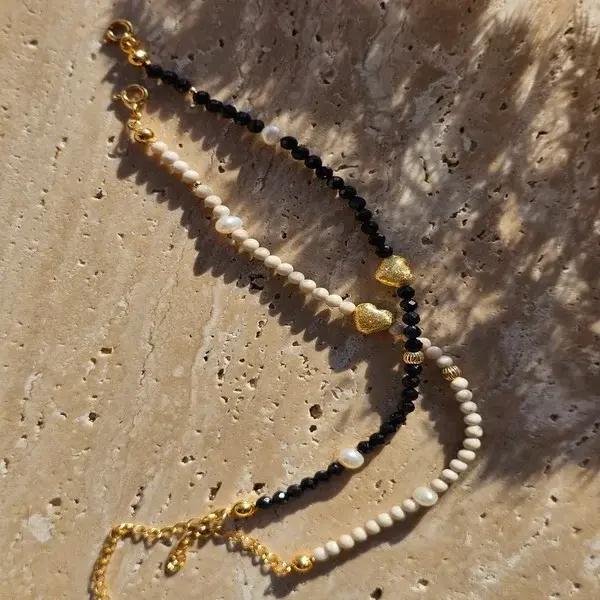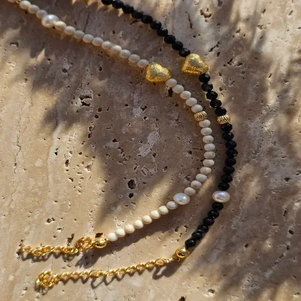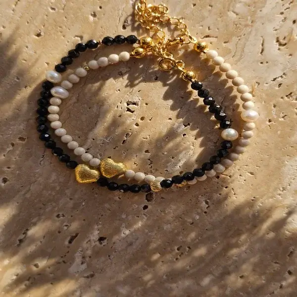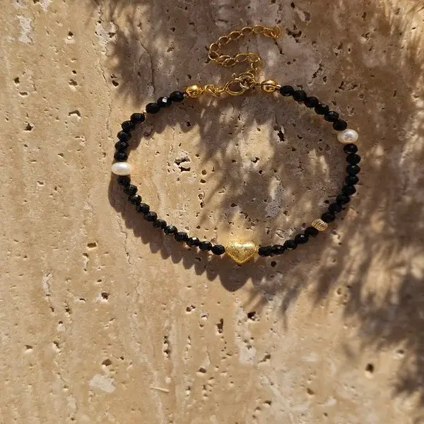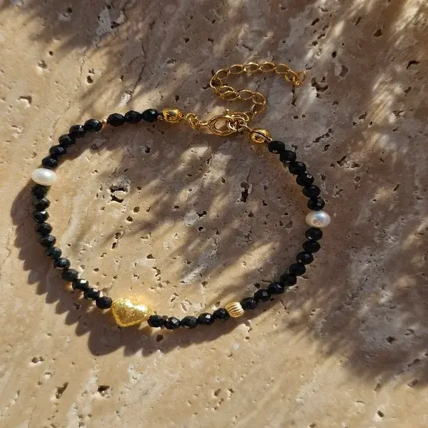 (Czas wysyłki: 5 dni)Bransoletka wykonana z turmalinów, pereł z dodatkiem pozłacanego serduszka ok. 8 mm (srebro próby 925). Na nici jedwabnej. Dodatki srebro pozłacane. Całkowita długość bransoletki 17 cm + 5 cm przedłużenia.