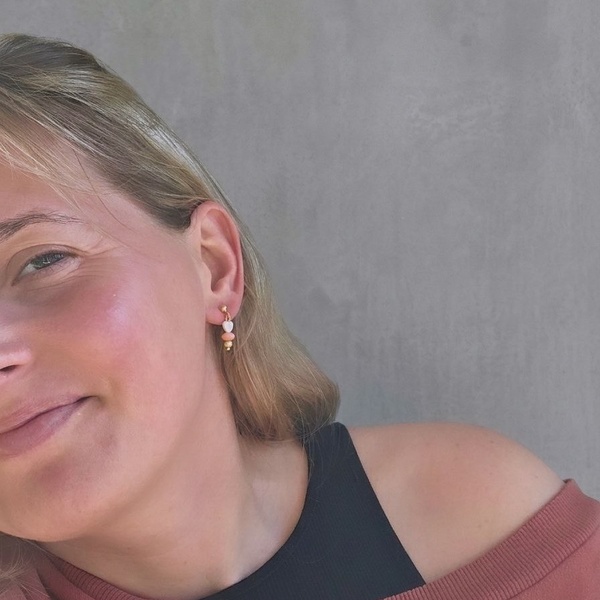 Srebrne kolczyki z dodatkiem zawieszki w kształcie serduszka z masy perłowej (ok 6 mm), kamienia koral w kształcie oponki w pięknym różowym kolorze i pozłacanej ozdobnej kuleczki.