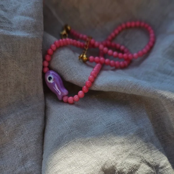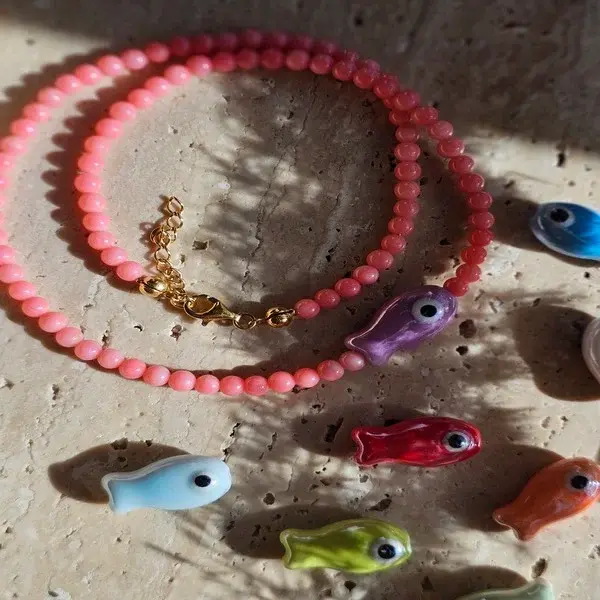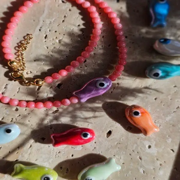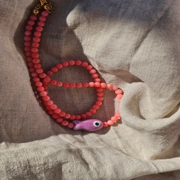 Naszyjnik z kamienia koral w pięknym różowym kolorze z dodatkiem ceramicznej rybki
