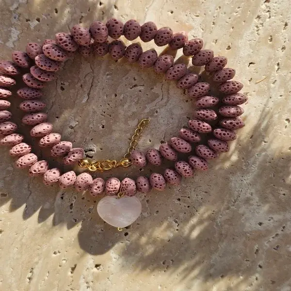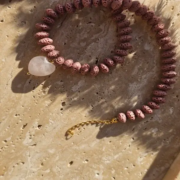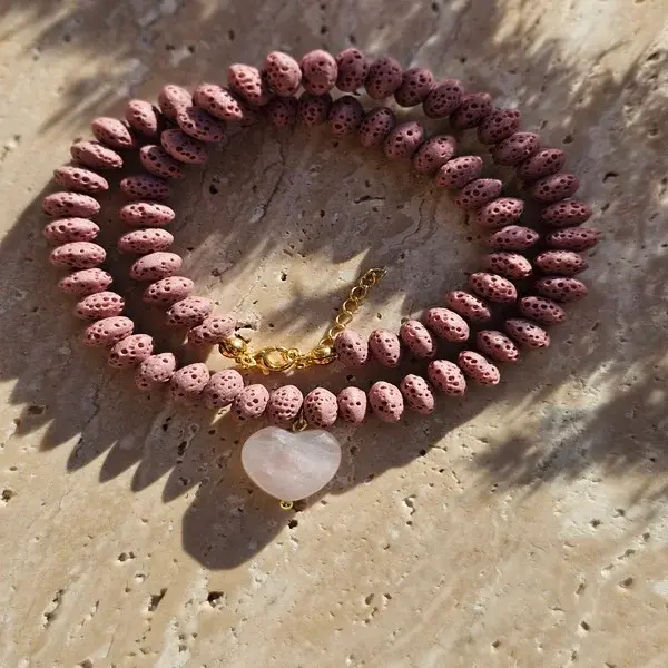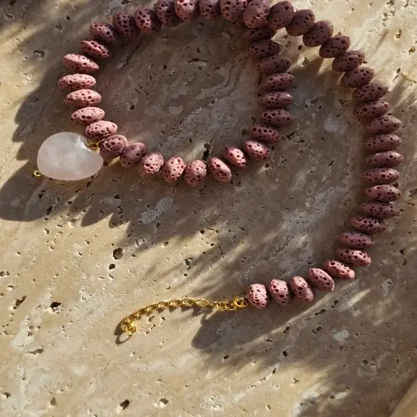 (Czas wysyłki: 5 dni)Naszyjnik wykonany z różowej lawy wulkanicznej z dodatkiem zawieszki w kształcie serduszka z kwarcu różowego. Dodatki srebro pozłacane. Całkowita długość naszyjnika 40 cm + 3 cm przedłużenia.