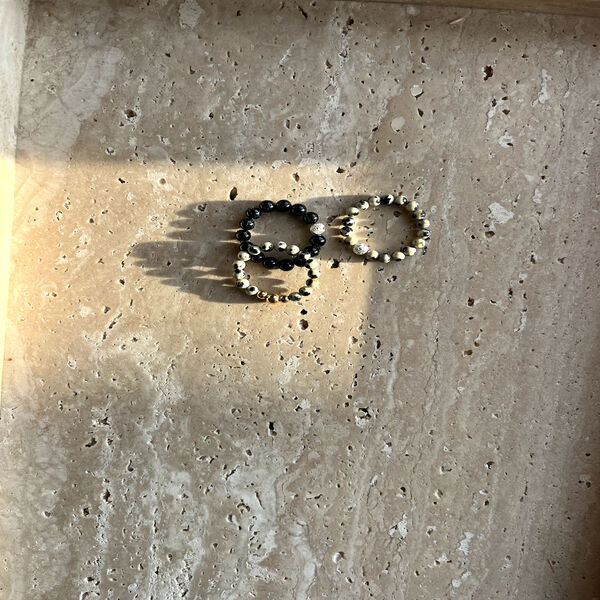 (Czas wysyłki: 5 dni)Pierścionek elastyczny wykonany z pięknego jaspisu dalmatyńskiego w czarne plamki i srebrnego koralika w kształcie ślimaka. Pierścionek wykonany na gumce elastycznej, dzięki czemu nie będzie uciskać i idealnie dopasuje się do paluszka, bez konieczności wyboru konkretnego rozmiaru. Doskonale sprawdzi się jako codzienny dodatek, ale również jako subtelny akcent do eleganckiej stylizacji.