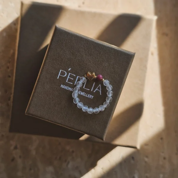 Pierścionek z kryształu górskiego, kamienia rodonit i srebrnego serduszka